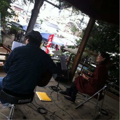日差しがちょうど照りつける中、なんとなくなんとなく、雨にぬれても、上を向いて歩こうを演奏してきました。
